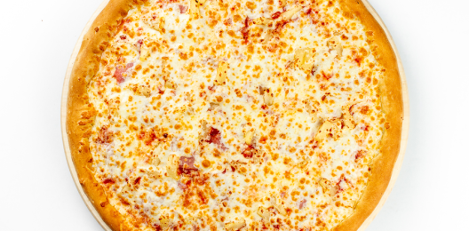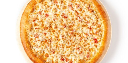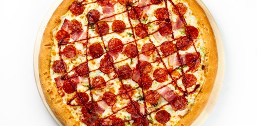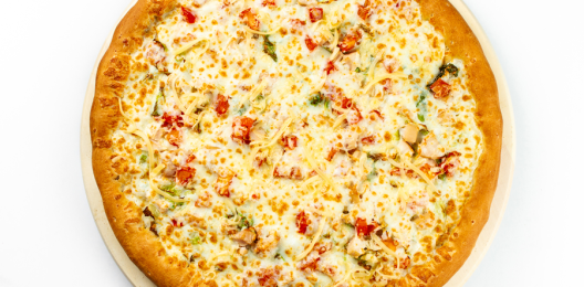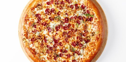 Фирменный горчичный соус, сыр моцарелла, ветчина, цыпленок гриль, колбаски охотничьи, свежие томаты, маринованные огурчики, красный лук, зелень. (31 см) КБЖУ на 100 г: 220/8,5/10/24